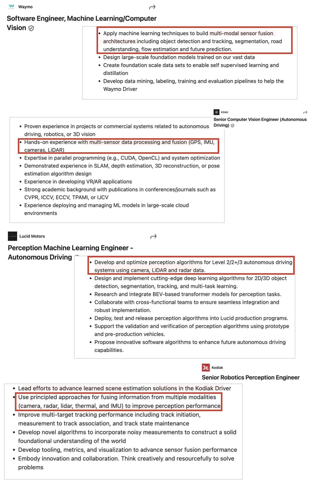 Back when I joined the self-driving car world, my role was "Computer Vision", and all I knew was cameras. My colleagues were LiDAR Engineers, Kalman Filter Engineers, RADAR Engineers, and had ZERO IDEA of how Computer Vision worked... I was even shocked that they would not know any Deep Learning... and yes, in lots of companies, this total separation of jobs still makes sense...