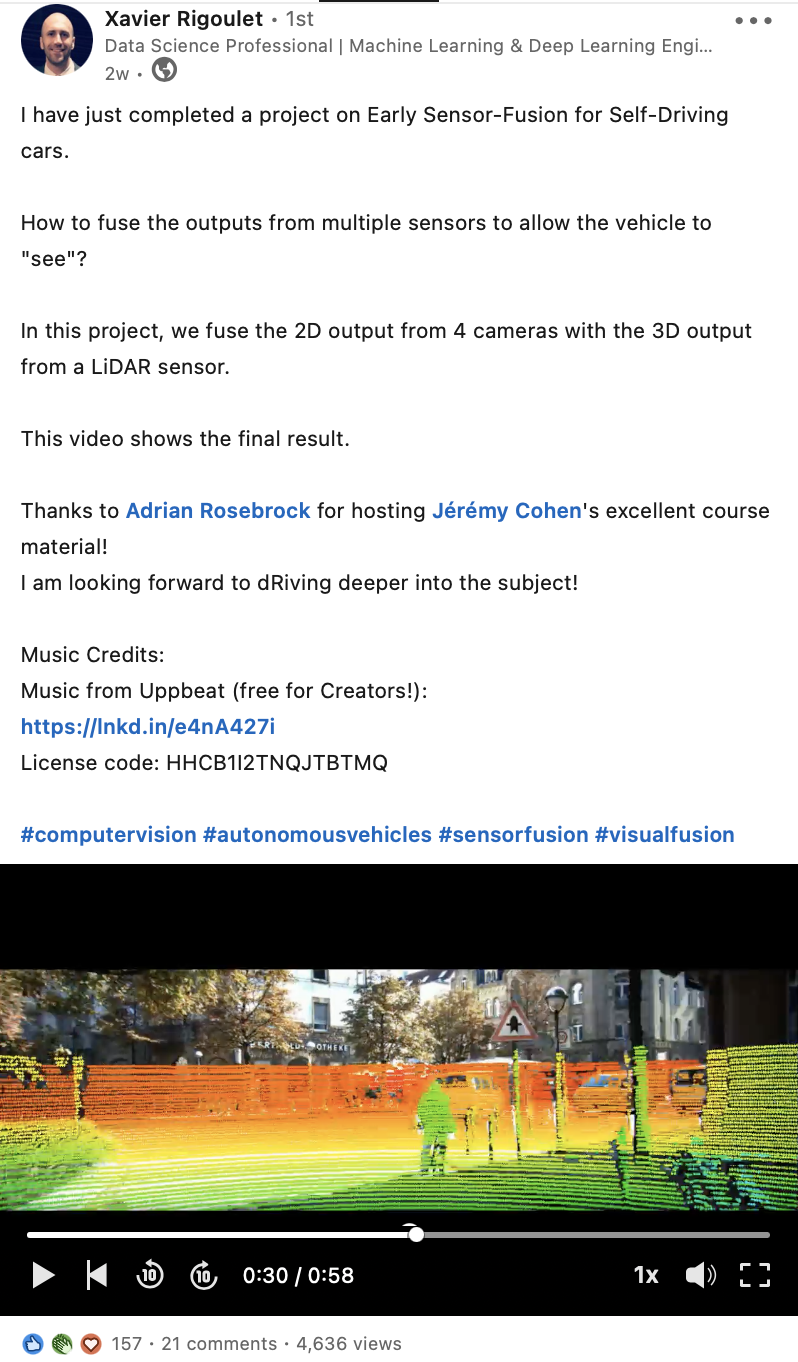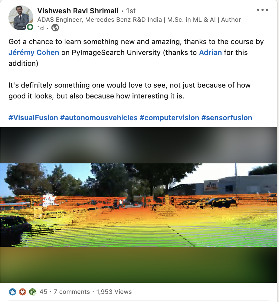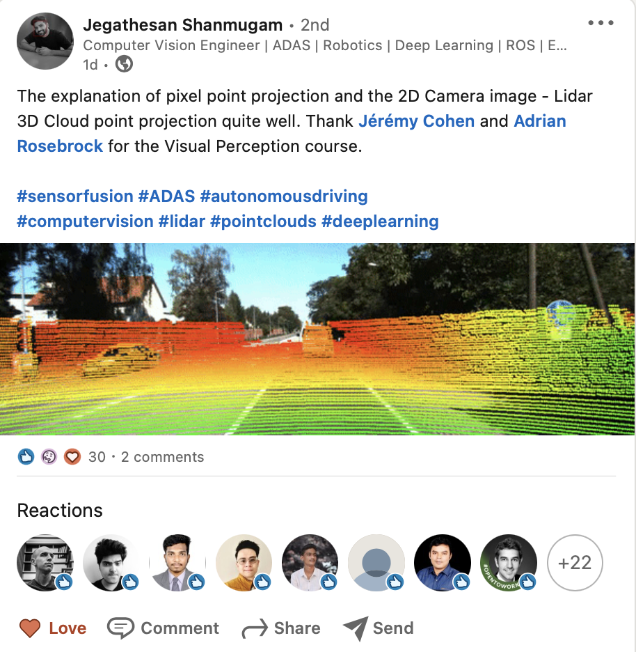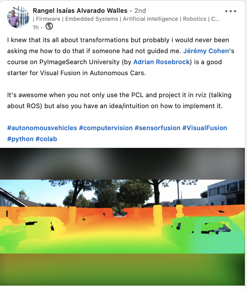 "At first, I wasn't sure where to start in terms of the underlying algorithms of developing a multi-sensor perception system and wasn't sure that an online course would answer all my questions, but Jeremy really knows his stuff!