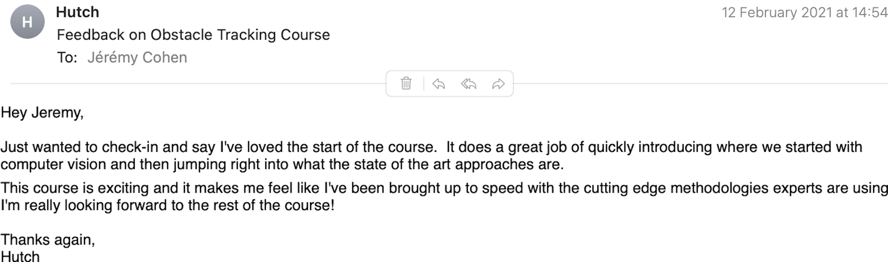 "Despite financially burdening myself, I couldn't hold myself back from buying the revamped Obstacle Tracking course. I believe in you and I am pretty sure that your course (along with Adrian Rosebrock's PyImageSearch University, which was recommended by you BTW) will empower me to be one of the Egdeneers!